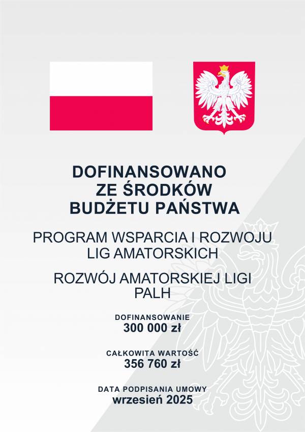 Rozgrywki Ligi PALH w sezonie 2025 zostały dofinansowane ze środków budżetu państwa w ramach programu Wsparcia i Rozwoju Lig Amatorskich, zadanie "Rozwój amatorskiej LIGI PALH". Wartość dofinansowania: 300 000 zł, całkowita wartość zadania: 356 760 zł. Data podpisania umowy WRZESIEŃ 2025.